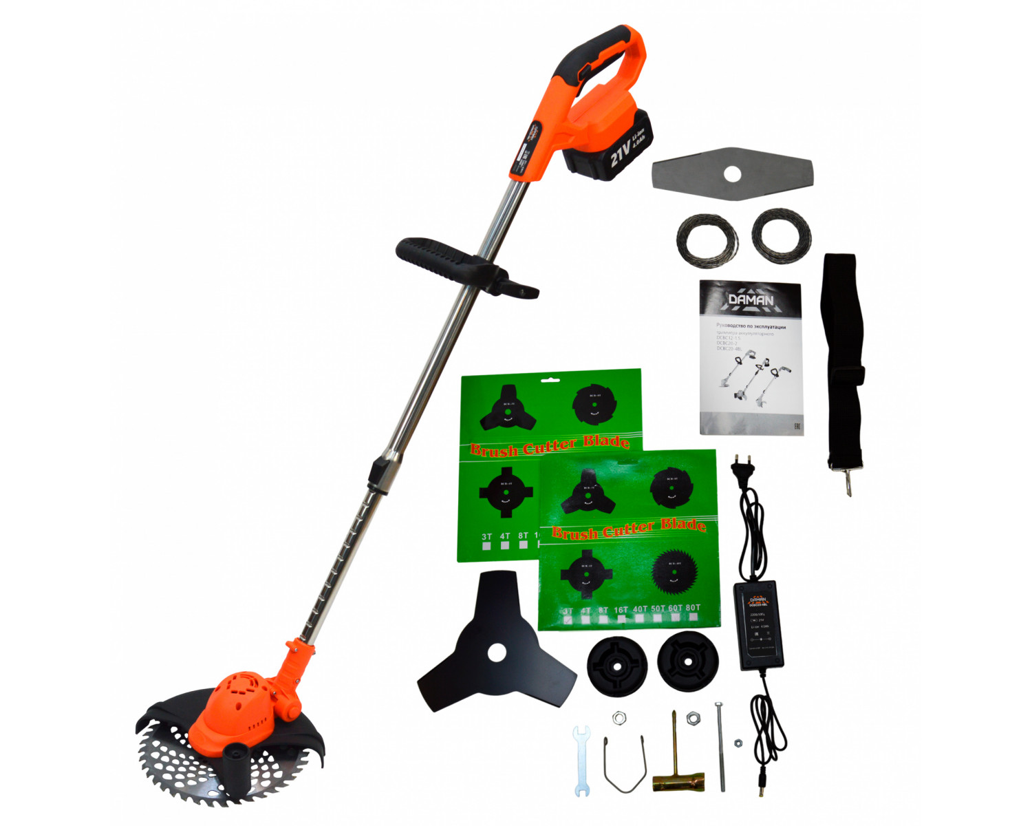 Комплектность Зарядное устройство (21В; 2,0А) - 1шт, АКБ (21В; 4,0А/ч) - 1шт, Нож (2Т) - 1шт, Нож (3Т) - 1шт, Нож (48Т) - 1шт, Головки триммерные - 1шт, Лески триммерные (3м) - 1шт.