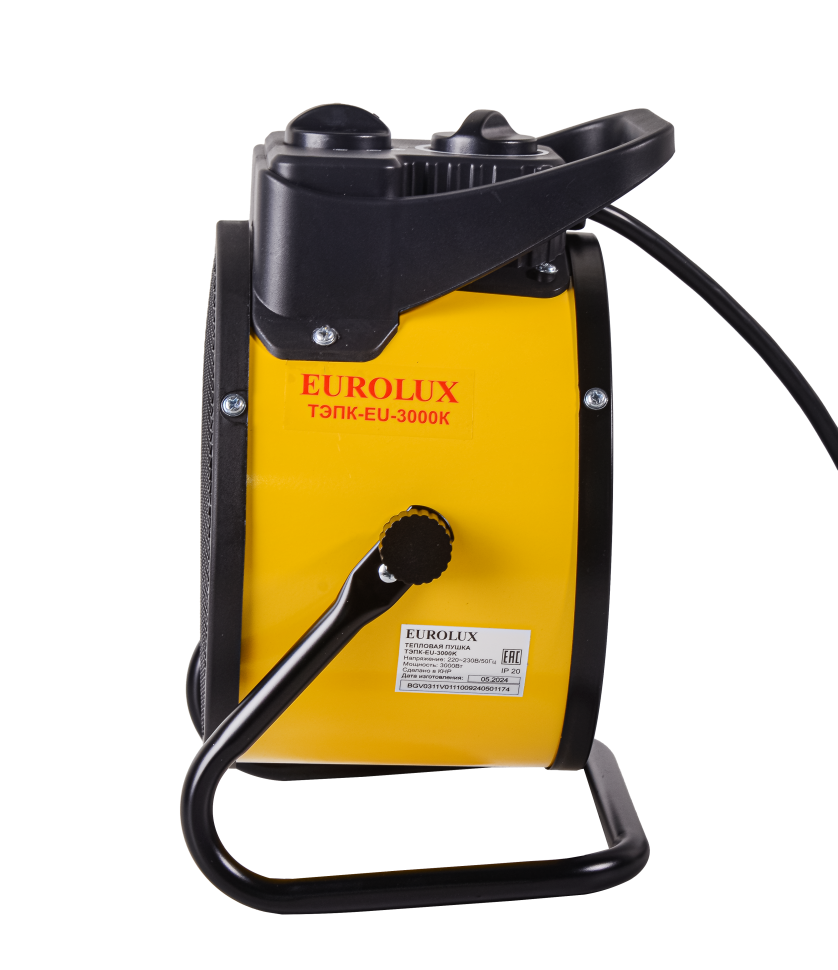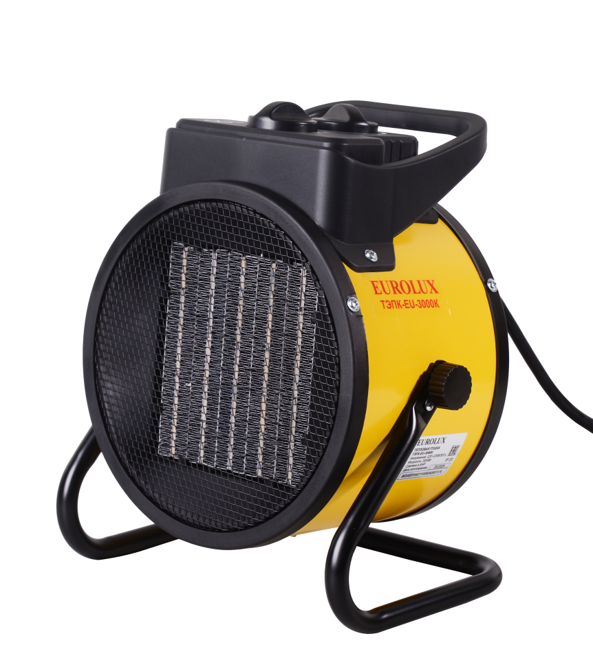 Модель Eurolux ТЭПК-EU-3000К имеет металлическую подставку для устойчивого размещения на различных поверхностях. С ее помощью можно изменять угол направления теплого воздуха. Панель управления, расположенная на корпусе, состоит из механических регуляторов режимов и температуры. Это позволяет автоматически поддерживать выбранный уровень нагрева. Круглая форма корпуса обеспечивает равномерное рассеивание тепла. Удобная ручка для перемещения расположена в верхней части электрической тепловой пушки.