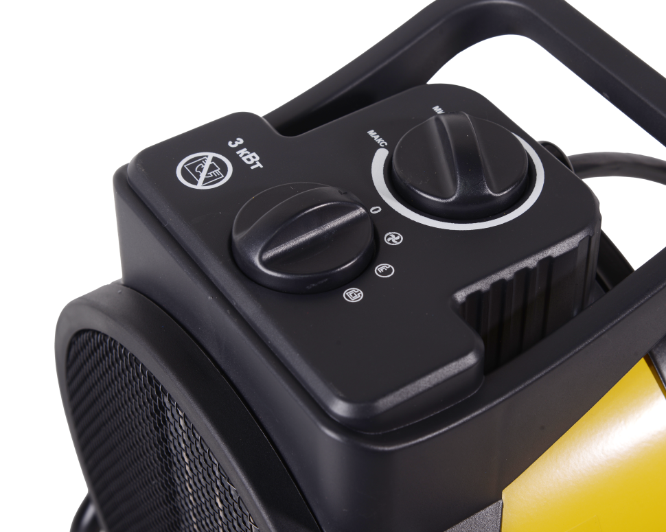 Тепловая пушка работает от однофазной сети в 3 режимах. В зависимости от особенностей помещения можно выбрать ступень нагрева мощностью 2000 или 3000 Вт. Для экономичного режима вентиляции достаточно 25 Вт. Даже при выборе максимальной мощности кислород не сгорает, а воздух не сушится. Отсутствие токсичных выхлопных газов позволяет использовать теплопушку в жилых помещениях. Для подключения к питанию предусмотрена евровилка.