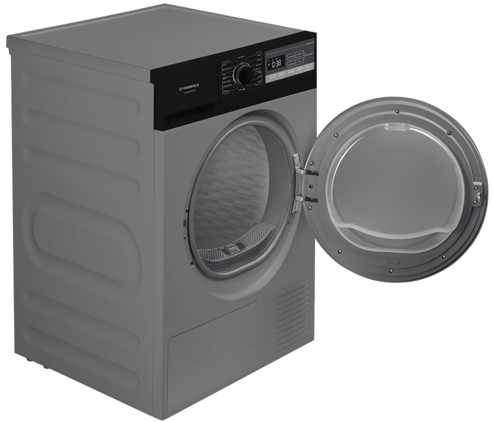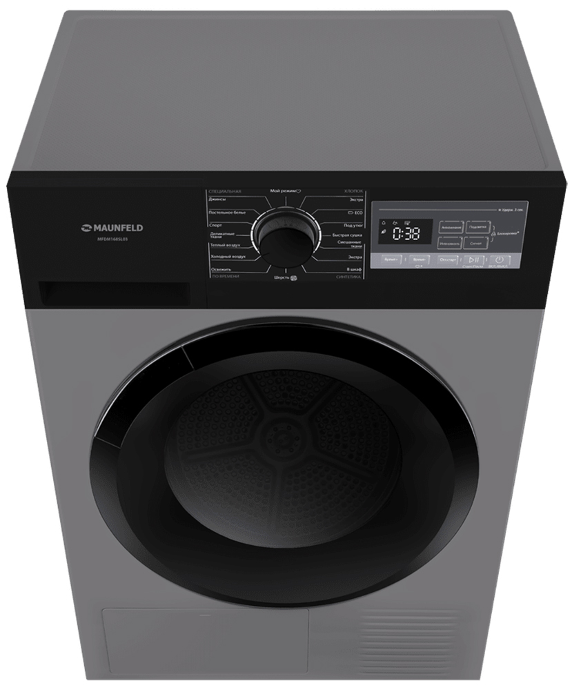 На дисплее отображаются основные параметры работы, а также возможна отсрочка старта до 24 часов. Машина оснащена универсальным мотором и барабаном из нержавеющей стали, что гарантирует долгий срок службы. Прибор предлагает 16 режимов сушки, включая экстра под утюг для хлопка, экстра в шкаф для синтетики, а также режимы для смешанных тканей, шерсти, деликатных вещей, постельного белья, джинсов, спортивной одежды и специальных тканей. Также доступна функция освежения паром, сушка по времени, а также теплый и холодный воздух.