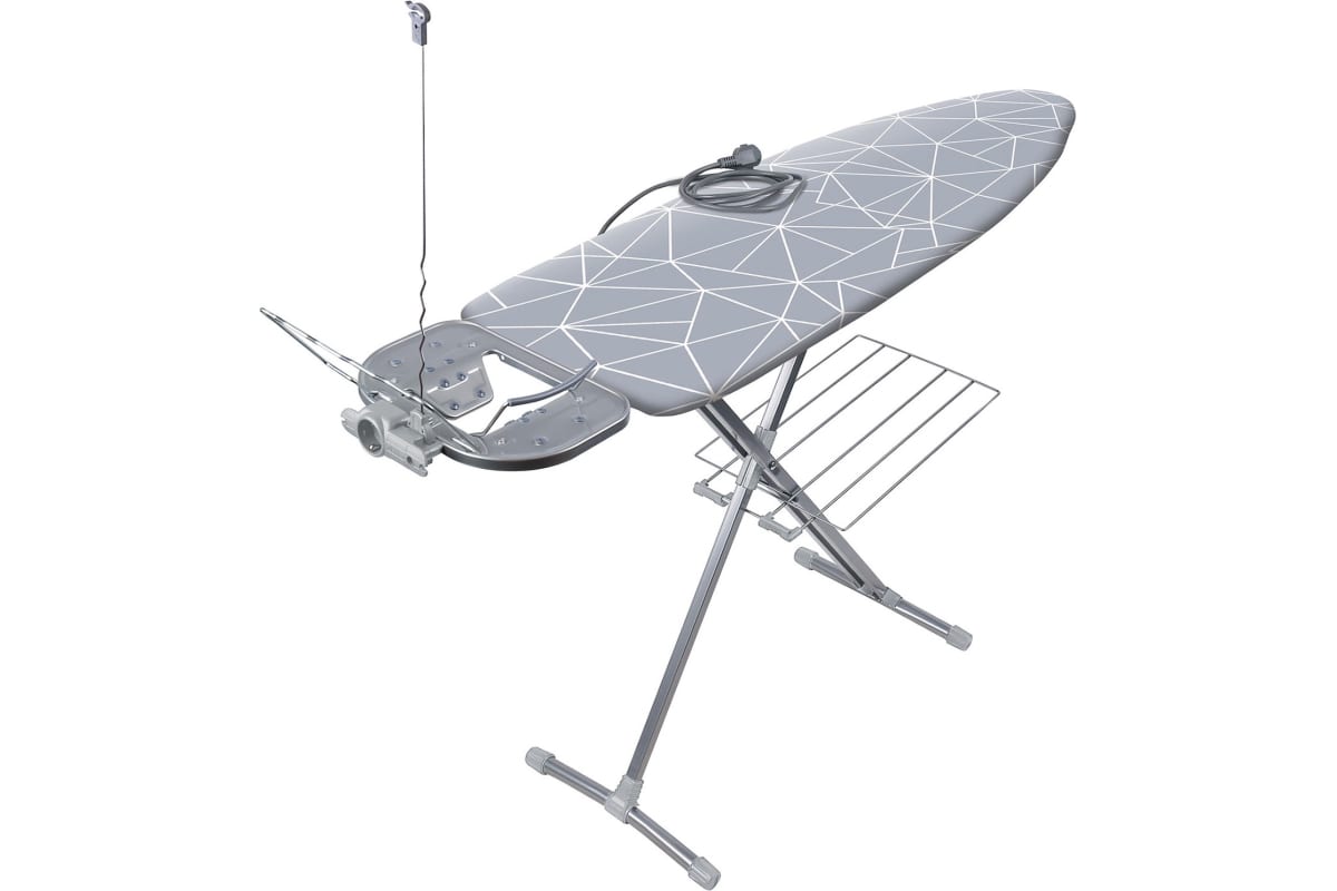 Гладильная доска предназначена для глажки белья. Модель оснащена электросоединителем и подставкой под утюг. Доску можно регулировать по высоте. В конструкции предусмотрена удобная полка для белья и переносной подрукавник.