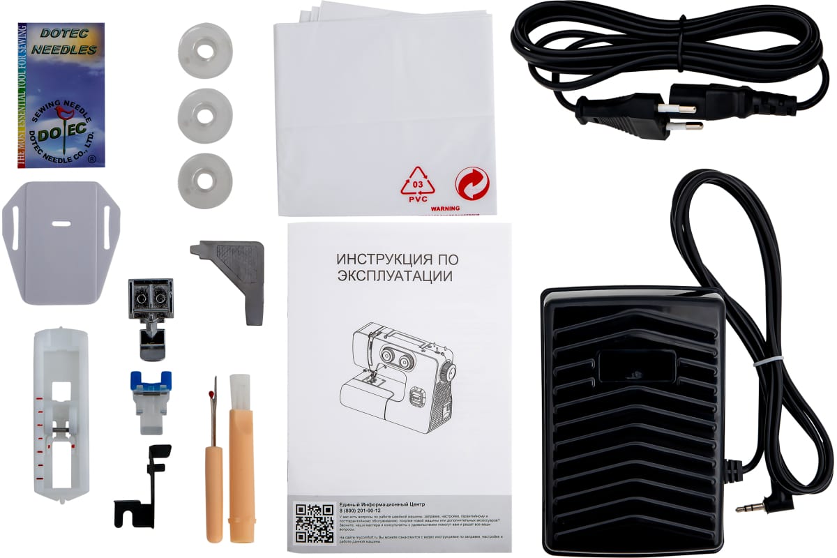 Инструкция по эксплуатации с напечатанным на обложке гарантийным талоном. Все принадлежности сложены внутри специального отсека для принадлежностей в выдвижном столике машинки. Чтобы открыть крышку этого отсека нужно поставить машинку перед собой и зацепив слева снизу машинки крышку потянуть ее на себя.