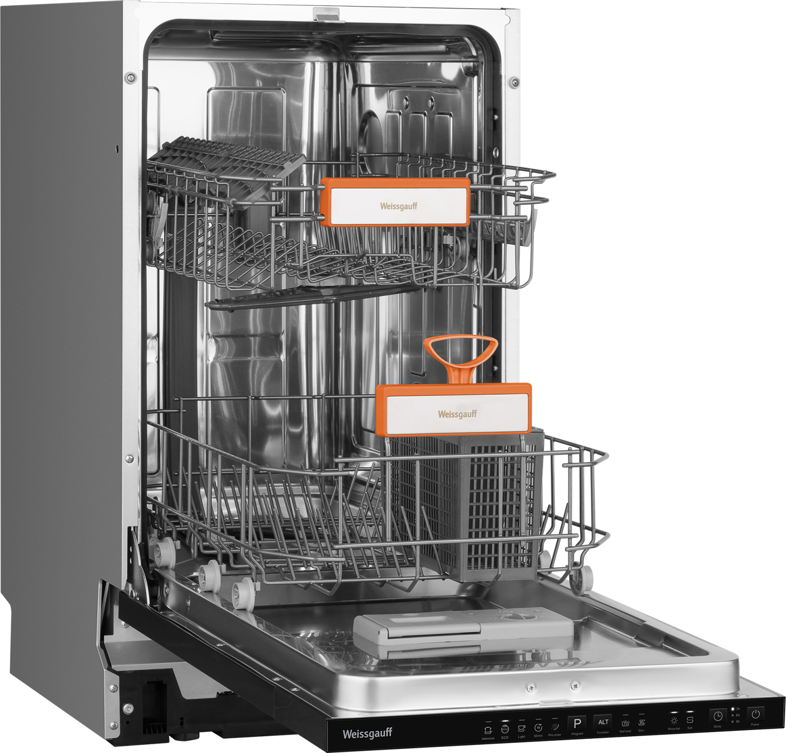 До 9 комплектов посуды одновременно вы можете расположить в данной посудомоечной машине, благодаря современным продуманным и эргономичным корзинам, которыми Weissgauff оснастили эту модель! 5 эффективных программ предлагают пользователю наиболее востребованные режимы: Интенсивная, Эко, Легкая мойка, 60 минут, Предварительная мойка