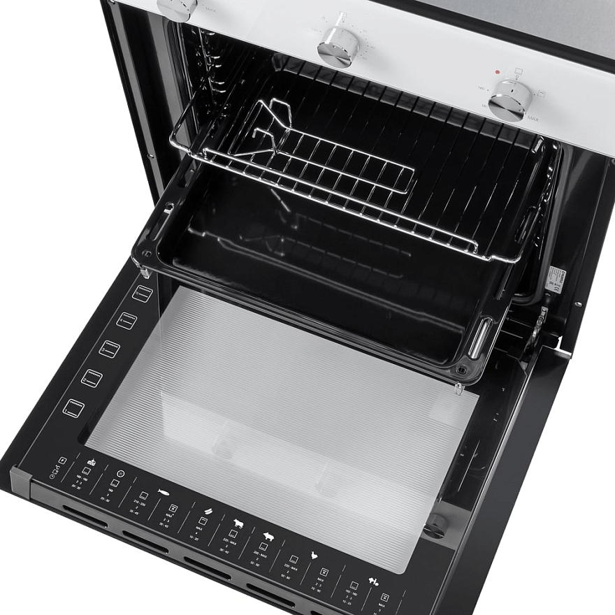 Модель предлагает 4 режима работы, включая верхний и нижний нагрев, конвекцию с верхним нагревом, гриль и гриль с конвекцией. Это обеспечивает гибкость при выборе метода приготовления и позволяет достичь идеального результата при готовке любого блюда. Внутренняя поверхность камеры покрыта эмалью легкой очистки, что облегчает уход за духовым шкафом. Полный газ-контроль обеспечивает безопасность использования, а устройство также оснащено стандартным противнем, глубоким поддоном и решеткой.