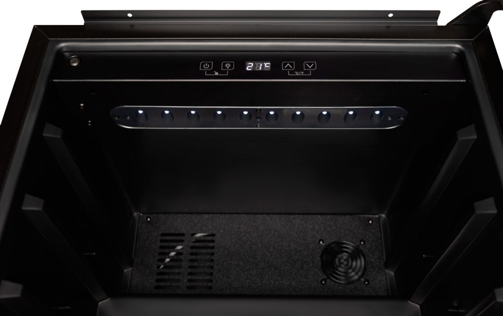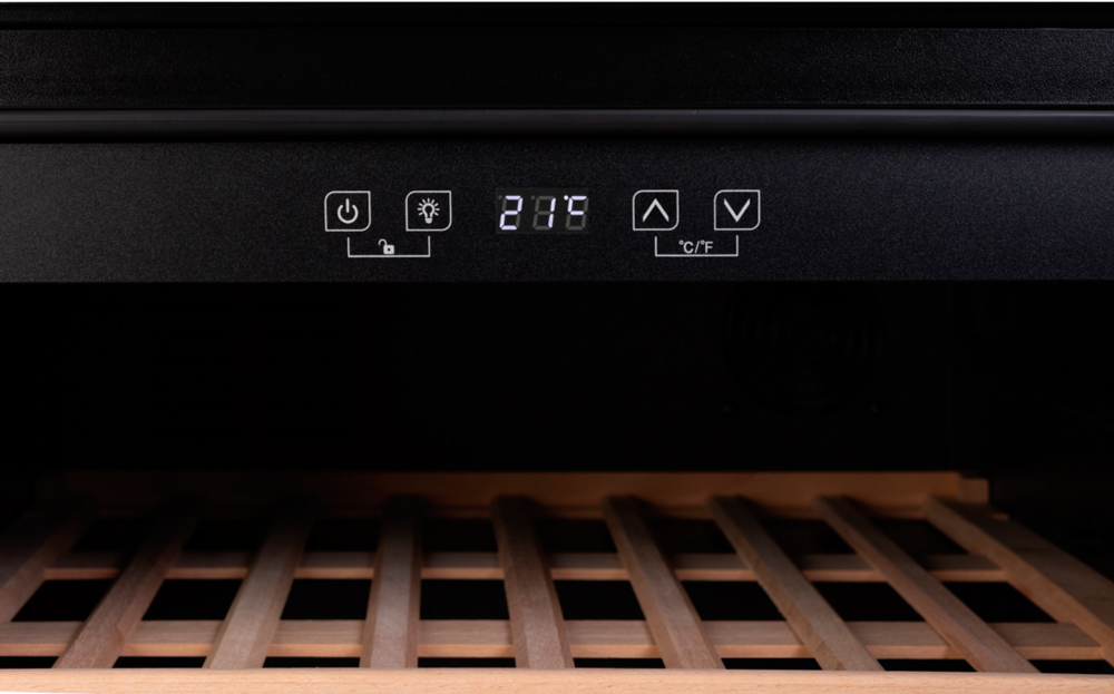 Особенность этой модели — защита стекла от УФ лучей. Это позволяет сохранить все полезные свойства вина, не подвергая его воздействию ультрафиолета. Сенсорное управление делает использование удобным и простым. Все необходимые параметры отображаются на светодиодном дисплее, расположенном внутри камеры. С его помощью можно легко регулировать температурный диапазон от 5 до 22 градусов Цельсия.