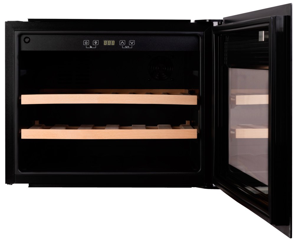 Устройство обладает двумя раздельными температурными зонами, что позволяет хранить разные сорта вина при оптимальных для них условиях. Вместительная камера позволяет разместить до 28 бутылок объемом 0.75 литра каждая. Для удобства размещения бутылок предусмотрено две деревянные полки, что также способствует сохранению оптимального микроклимата внутри.