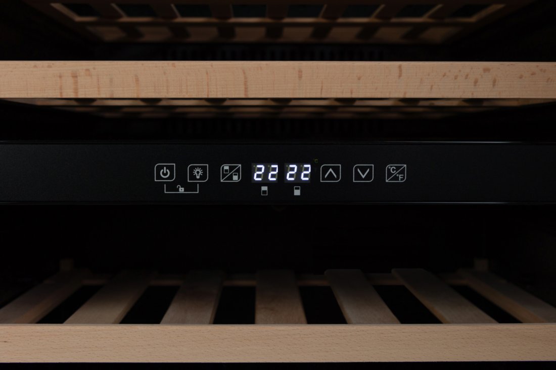 Особенностью этого прибора является наличие двух раздельных температурных зон, что позволяет хранить разные виды вина при оптимальной температуре. Диапазон регулирования температуры составляет от 5 до 22 градусов Цельсия. Индикация температуры в холодильной камере позволяет контролировать условия хранения вина.