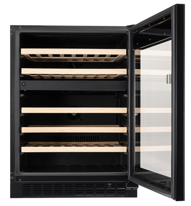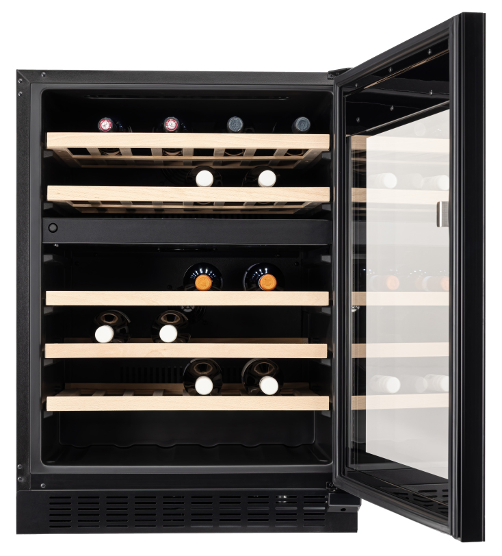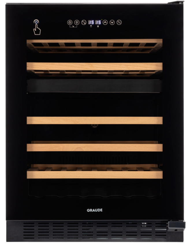 Встраиваемый под столешницу винный шкаф Graude FWK 80.2 оснащен 5 полками из бука и вмещает в себя 46 бутылок. 2 температурные зоны дают возможность хранить разные вина. Электронная система регулировки температуры с сенсорными кнопками позволит точно контролировать температуру, чтобы напиток как можно дольше с сохранял свой вкус.
