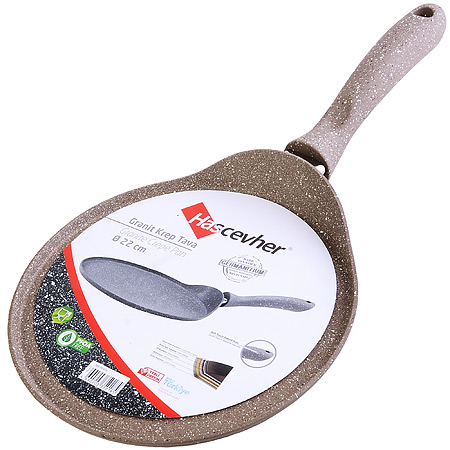 Блинная сковорода с мраморной крошкой Hascevher выполнена из штампованного алюминия с антипригарным покрытием особой прочности. Удобная бакелитовая эргономичная ручка, которая не нагревается в процессе приготовления пищи. Подходит для использования на всех типах плит, кроме индукционных. Подходит для мытья в посудомоечной машине.