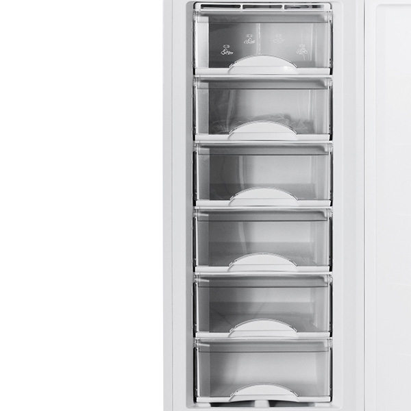 В морозильной камере размещается шесть цельнолитых ящиков из пластика. Прочные ящики легко выдерживают вес продуктов, они оснащены удобными ручками, с помощью которых их можно удобно выдвигать и задвигать обратно.