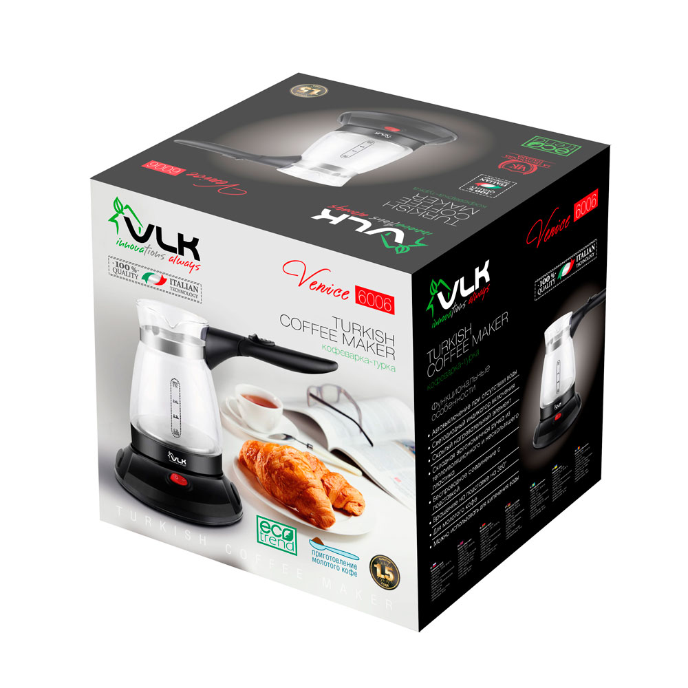 Представляем новинку – электрическую кофеварку-турку VLK Venice 6006 в элегантном черном цвете! Объем 0,5 литра и мощность 800 Вт делают эту кофеварку идеальной для быстрого и удобного приготовления вашего любимого молотого кофе. Корпус из стекла и пластика обеспечивает стильный внешний вид и долговечность устройства.