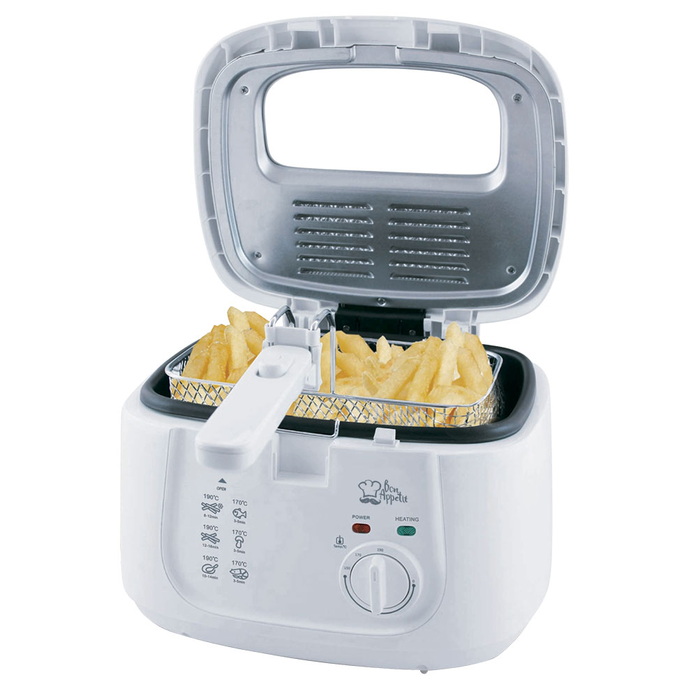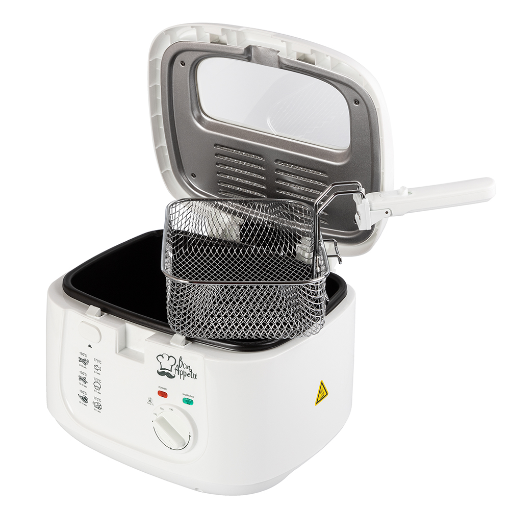 Особенности и дополнительные функции Температура приготовления: 150-190°С, Регулировка температуры приготовления, Минимальный объем масла 1,5 л, Световые индикаторы питания и нагревания, Прозрачное окошко на крышке, Корзина для фритюра с ручкой - 221*207*120 мм, Антипригарное покрытие чаши, Система фильтров против запаха и жира, Кнопка блокировки, Съемная крышка