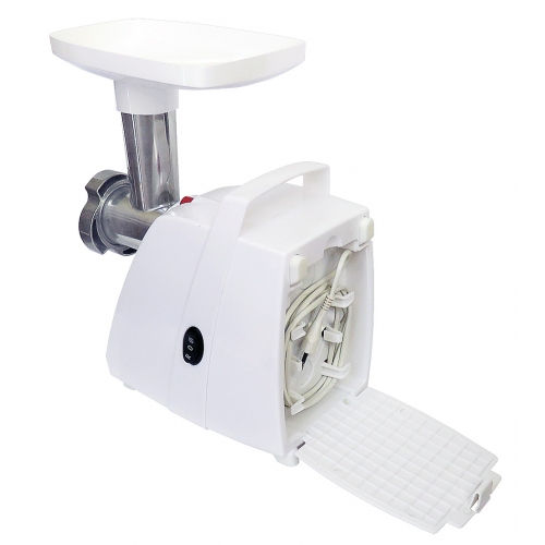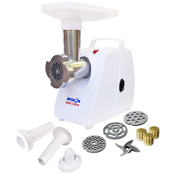 Электрическая мясорубка — электромеханическое устройство для получения фарша, которое также может использоваться для измельчения других видов продуктов, приготовления лапши, спагетти, печенья, сока из мягких фруктов и овощей, в том числе — из цитрусовых. Основные элементы мясорубки: мотор, корпус моторного блока (пластиковый или металлический), шнек, съемный шнековый контейнер, нож, решетка (металлический перфорированный диск), фиксирующая гайка.