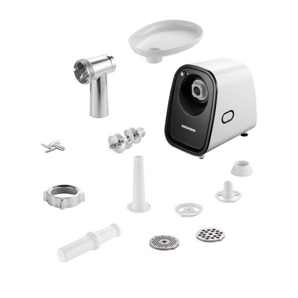 Комплектация блок мясорубки, загрузочный лоток, конусная насадка для кеббе, моторный блок, нож мясорубки, основание насадки для колбасок, перфорированные диски для различных видов фарша (2 шт.), руководство по эксплуатации, сервисная книжка, толкатель, фиксирующее кольцо, формирующая часть насадки для кеббе, формирующая часть насадки для колбасок, шнек мясорубки