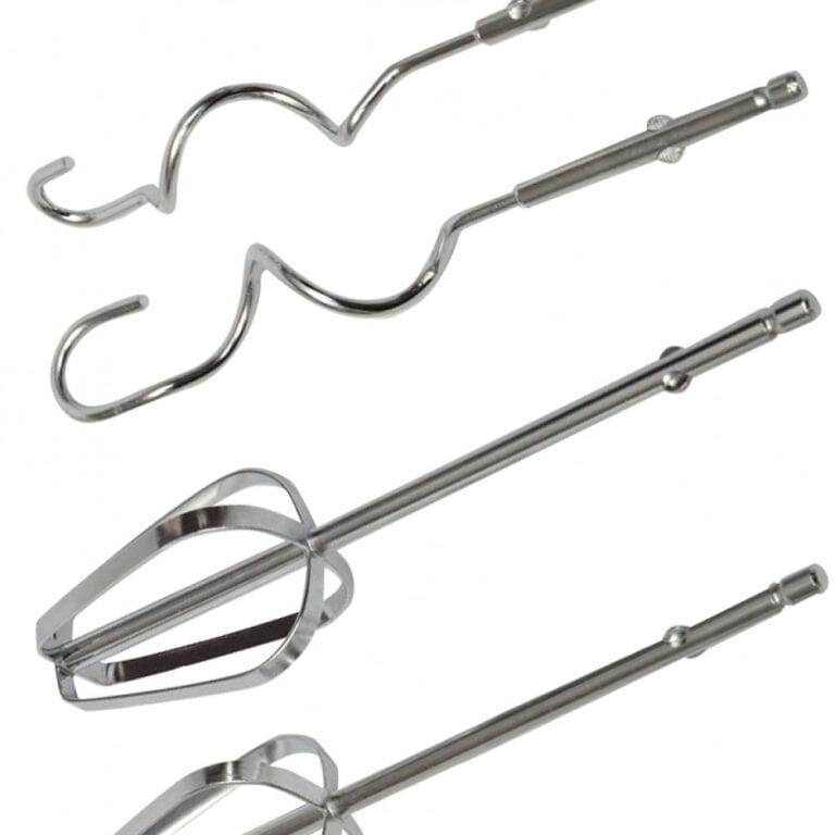 В комплект с прибором входят два венчика для взбивания и два крюка для вымешивания теста, изготовленные из высококачественной нержавеющей стали: насадки легко отделяются от корпуса нажатием специальной кнопки.