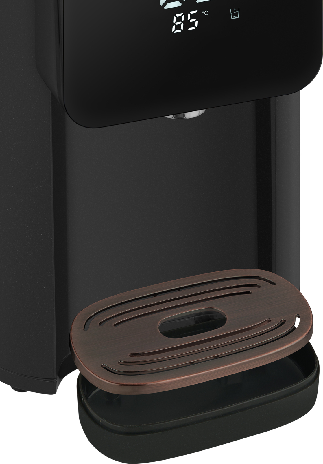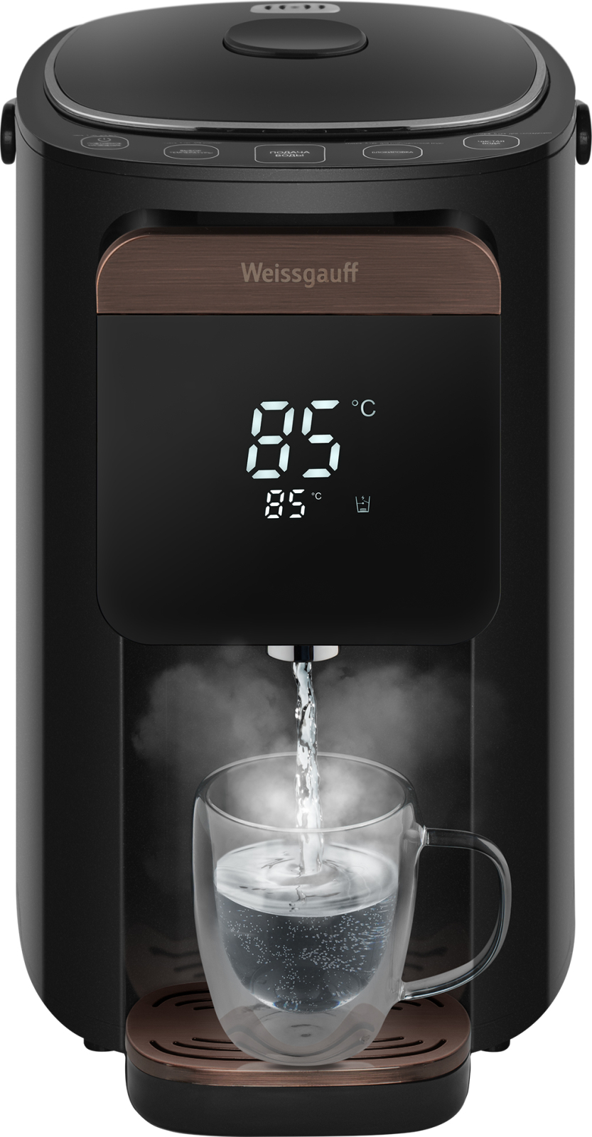 Вместительный и функциональный накопительный термопот от Weissgauff, выполненный в сочетании оттенков черного цвета и розового золота, обладает баком для воды объемом 5 литров, возможностью поддержания требуемой температуры в диапазоне от 45 до 95 °C, а также 6 уровнями регулировки нагрева, функциями повторного кипячения, быстрой очистки и приготовления щелочной воды.