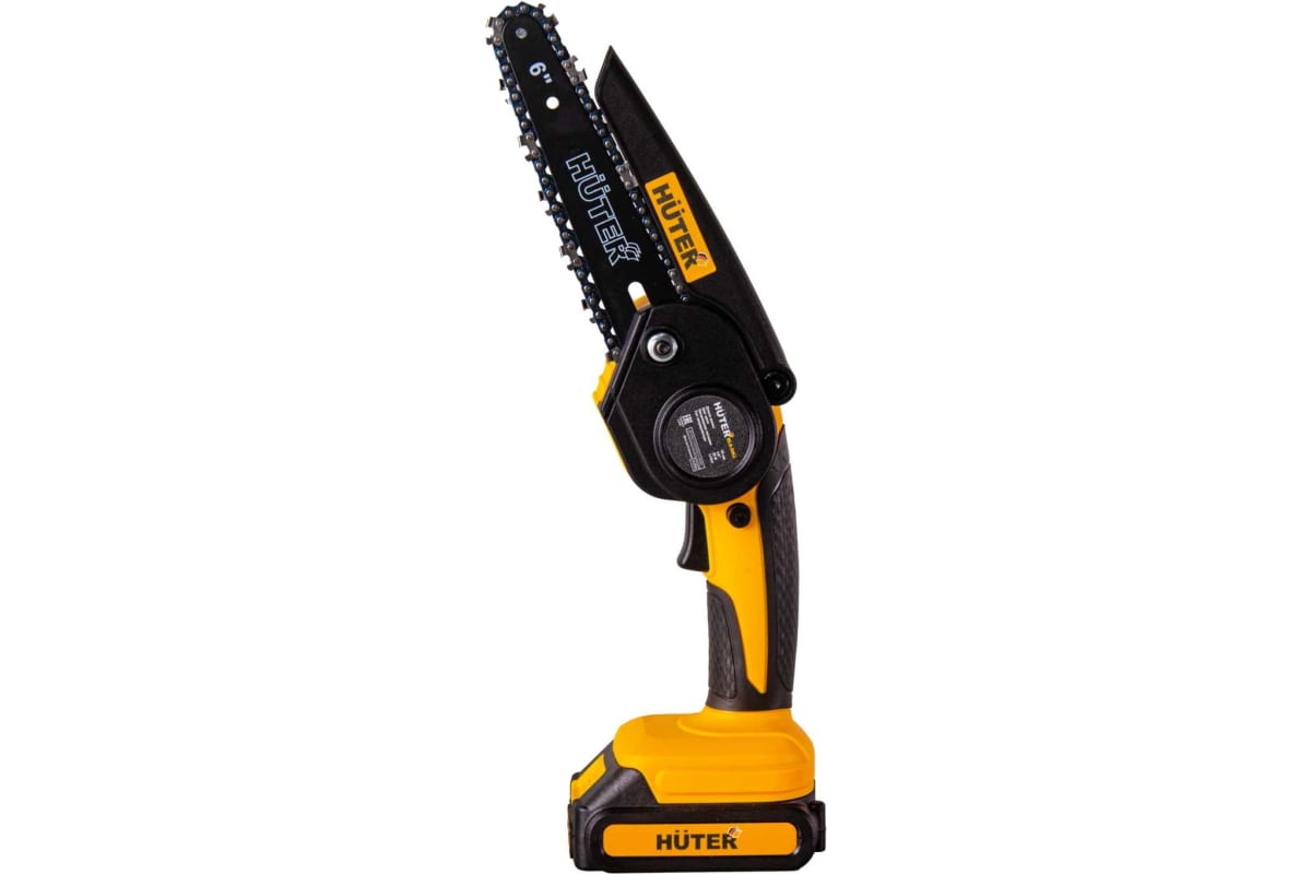 Аккумуляторная цепная пила удобно лежит в руке благодаря прорезиненной рукоятке. Для безопасности оператора предусмотрены защита от случайного пуска и защитный кожух цепи. В модели Huter ELS-20Li длина шины составляет 150 мм под цепь из 36 звеньев с шагом ¼. Ее необходимо смазывать каждые 10 - 15 пропилов, т.к. в инструменте отсутствует автоматическая смазка цепи.