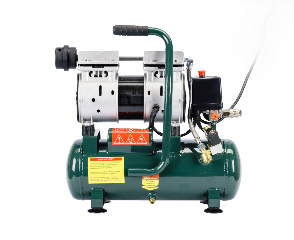 Корпус оборудован опорами с резиновыми ножками, которые обеспечивают устойчивость компрессора на поверхности и снижают уровень вибраций во время его работы.