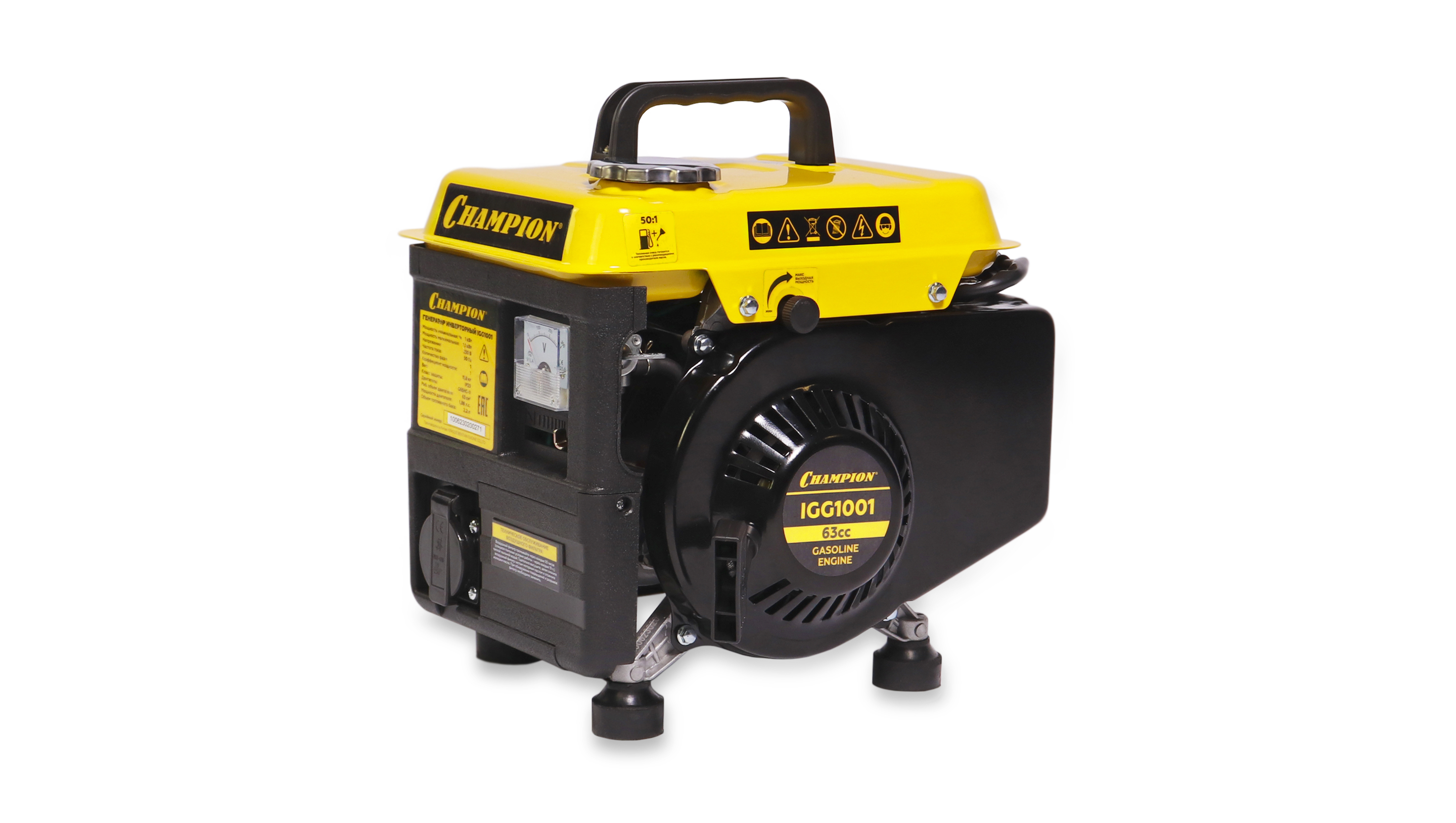 На корпусе бензогенератора Champion IGG1001 расположены следующие элементы управления: вольтметр, заземление, рычаг управления воздушной заслонкой карбюратора, крышка воздушного фильтра, розетка переменного тока 16А (230В) и разъём постоянного тока 12 В/5 А, выключатель зажигания.