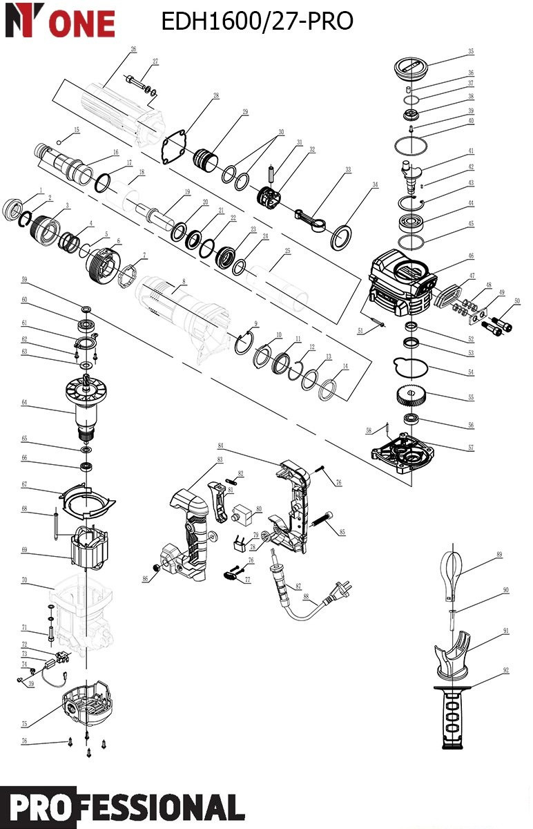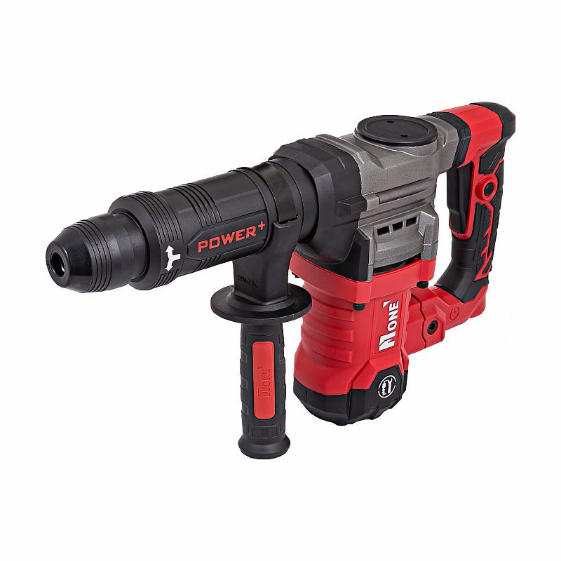 Комплектация — кейс, рукоятка боковая, банка для масла смазочного, ключ гаечный, ключ шестигранный S6, зубило, плоское долото, запасные щетки.